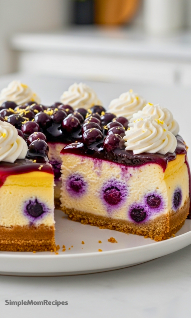 This Lemon Blueberry Cheesecake is tart, creamy, and utterly dreamy. A buttery graham cracker crust holds a smooth lemon-scented cheesecake studded with juicy blueberries. It bakes into silky perfection and is finished with a homemade blueberry sauce and cloud of whipped cream. Chill overnight to slice beautifully and savor every tangy, fruity bite.