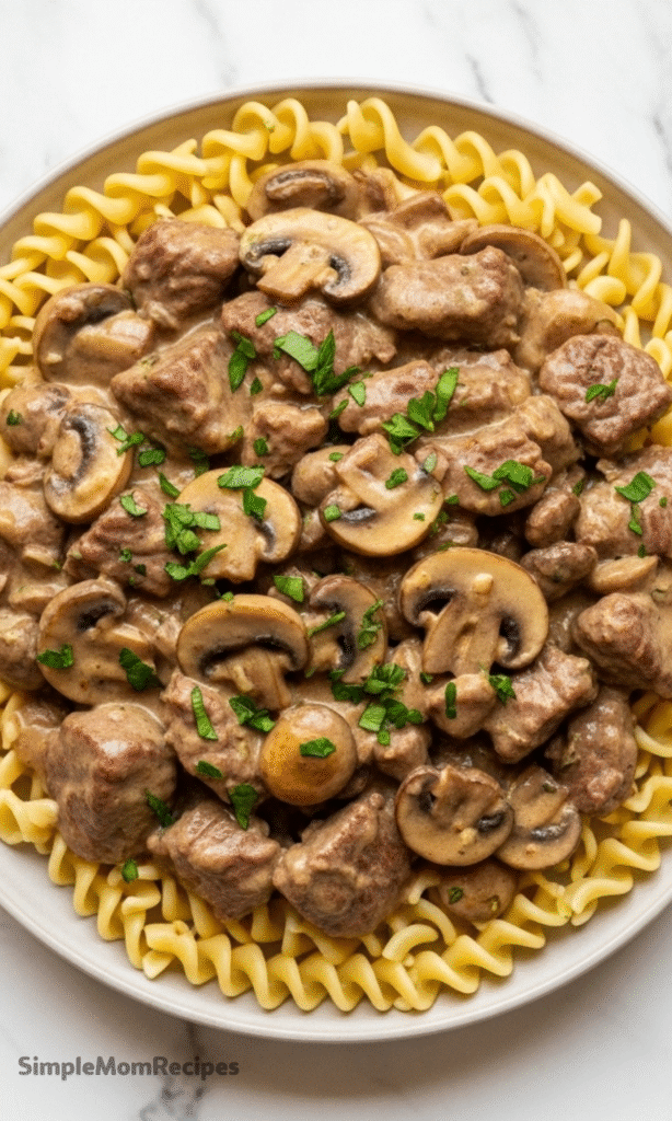 You come home to tender beef and mushrooms swimming in a rich, creamy sauce that just begs to be poured over something hearty. It’s comfort in a bowl, with practically none of the fuss.
