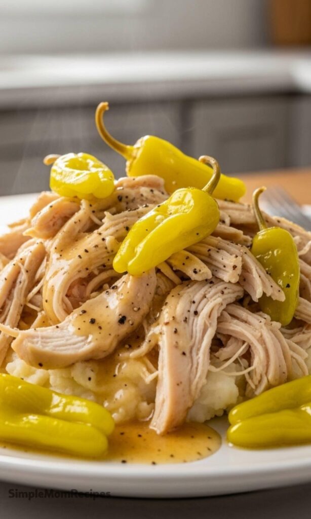 If you haven’t had it before, Mississippi Chicken is basically the easier, quicker cousin of that famous Mississippi Pot Roast. Instead of beef, you’re using chicken breasts, but the magic happens with the same simple ingredients – ranch seasoning, au jus mix, butter, and those tangy pepperoncini peppers.