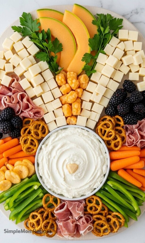 - Cheese spread – Forms the bunny’s face and acts as the main dip for pretzels and vegetables.