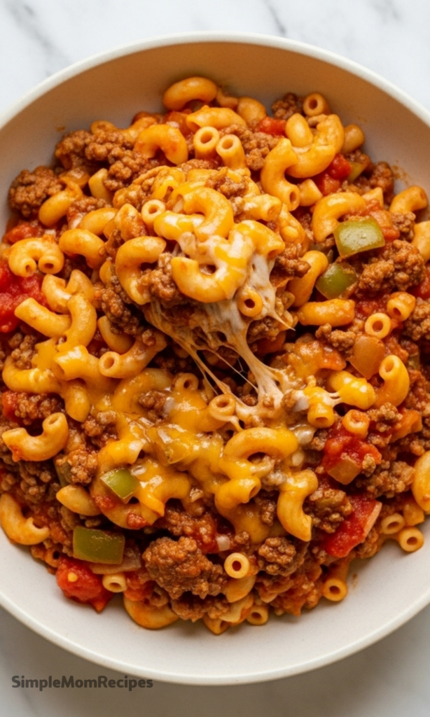 This is American-style goulash, not the Hungarian version with paprika-heavy broth. It’s the hearty, tomato-based, pasta-loaded kind that feeds a crowd and somehow tastes even better the next day.