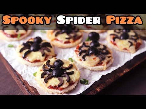 Once they are out of the oven, arrange the olives into spiders. You can check the video here on making bread pizza or Halloween spider pizza. Place the head and body and then thin slices of olives to represent the legs of a spider.