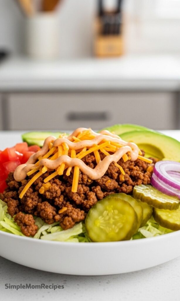 This bowl is loaded with seasoned ground beef, melty cheddar, crunchy lettuce, juicy tomatoes, pickles, red onion, avocado, and a creamy burger sauce that ties the whole thing together. It’s simple. It’s filling. And I can have it on the table in under 20 minutes, which matters on weeknights when I’m tired and hungry.