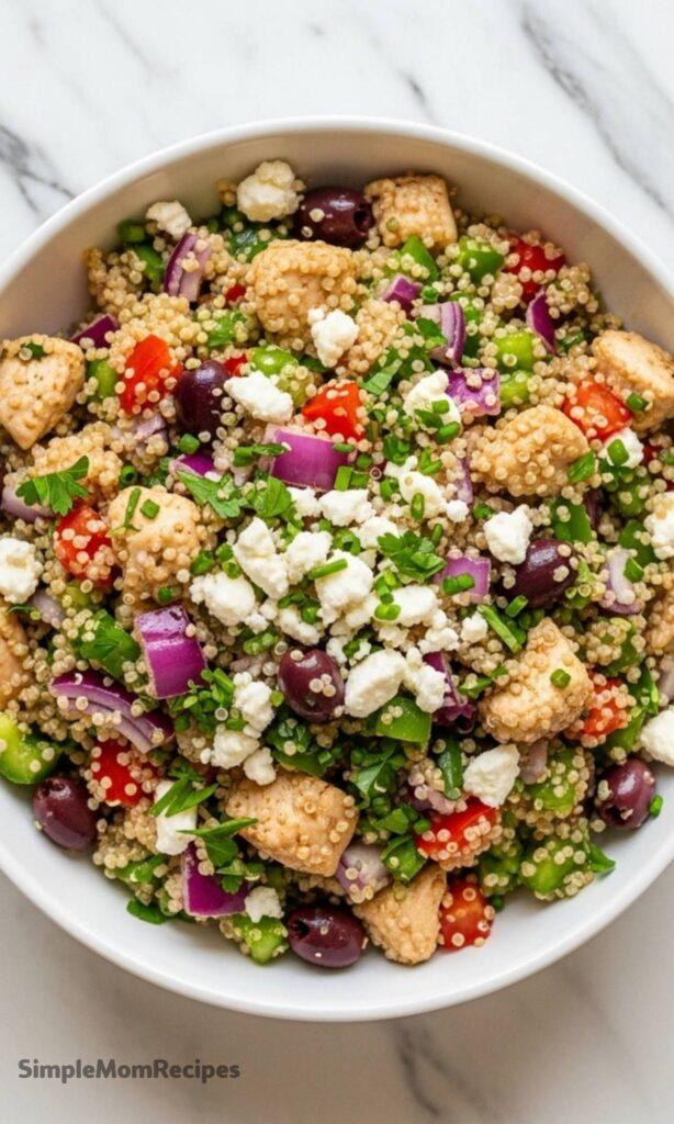 Add chicken (if using), onion, bell pepper, olives, feta cheese, parsley, chives, and salt to quinoa.