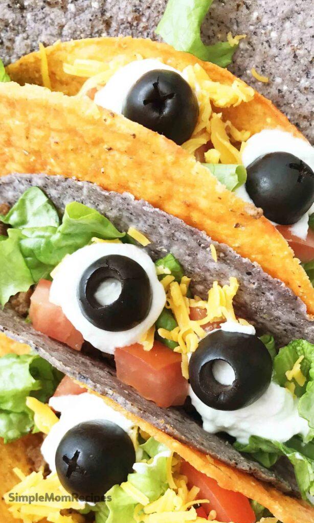 To create monster eyes: add two small dollops of sour cream to the top of each taco. Cut olive slices into tiny black circles and place one in the center of each dollop.