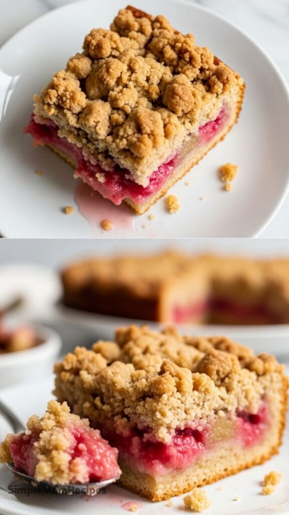 First bite is always a mix. Sweet from the cake, tart from the rhubarb, and then that slight chew where the fruit didn’t fully melt. If you scoop from the edge, you get more crisp bits. Middle is softer, almost spoonable.