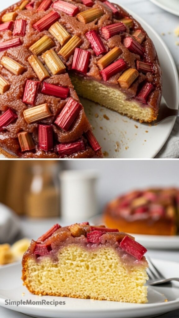 Fresh from the oven, the top turns glossy and slightly jammy – a rhubarb cake that flips into something unexpectedly bright and buttery.