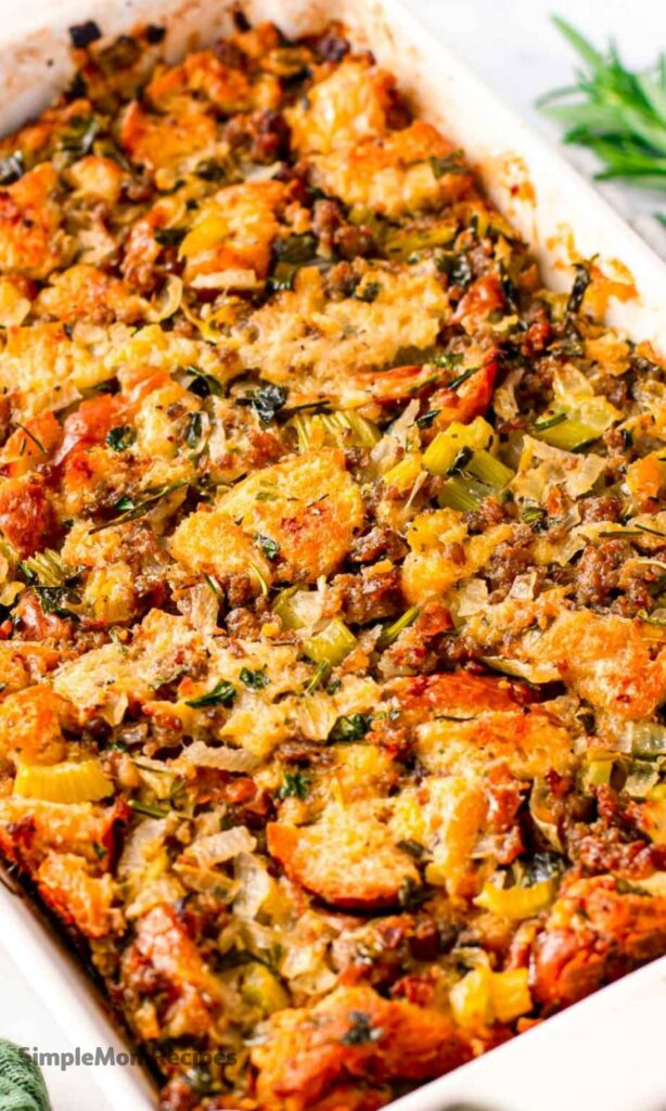 The crunchy, golden brown top is the best part. This savory, herb-packed stuffing is studded with savory pork sausage, buttery vegetables, and a medley of fresh herbs. Baked to perfection in a casserole dish, it delivers a satisfying contrast between the crisp top and soft, fluffy interior — think of it as a savory bread pudding worthy of the Thanksgiving spotlight.