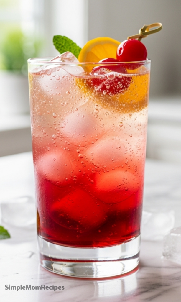 Top with 1-2 maraschino cherries and place an orange slice or lemon wedge on the rim. Add a sprig of fresh mint for elegance. Serve immediately with a fun straw or cocktail umbrella for extra charm.