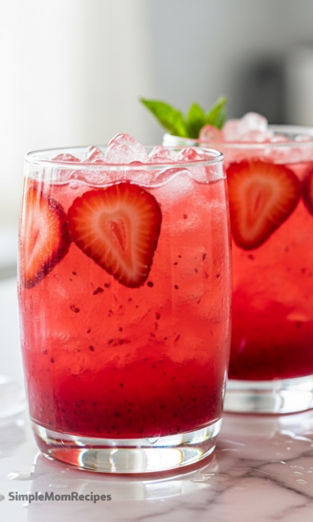 I fill glasses with crushed ice, toss in a few sliced strawberries, then pour the refresher right over the top.