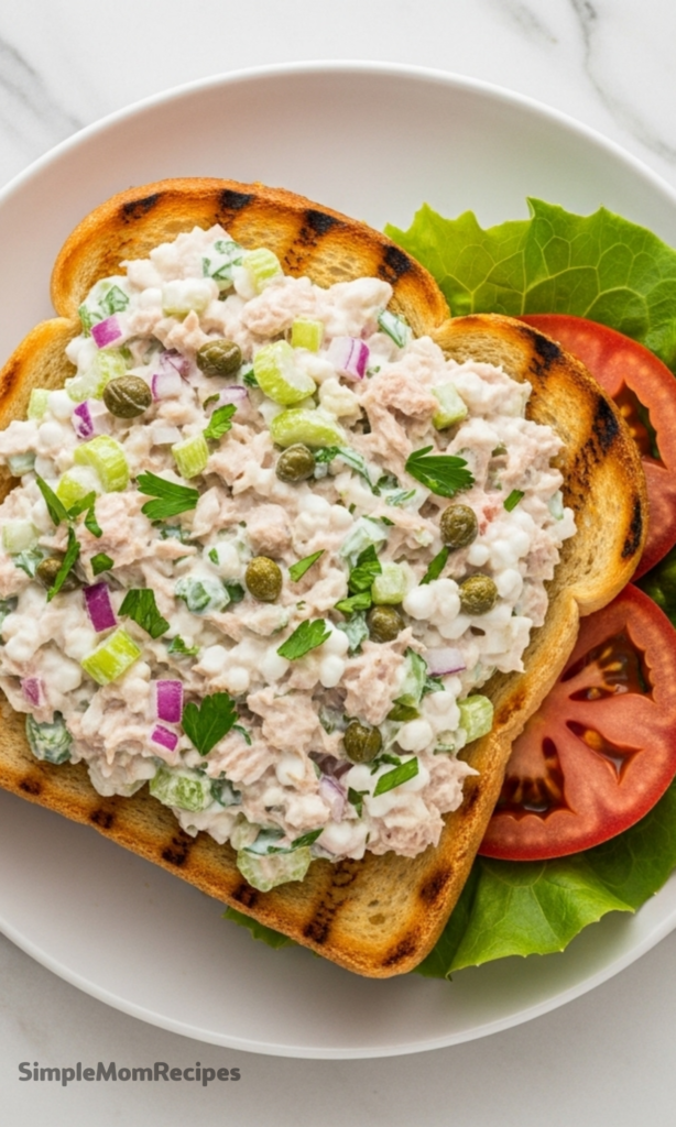 This tuna salad sandwich recipe features a secret ingredient—cottage cheese—that adds creaminess, richness, and extra protein without overpowering the classic tuna flavor. With bright notes from lemon juice, capers, fresh herbs, and crunchy celery and red onion, it’s a refreshing yet satisfying lunch ready in just 10 minutes.