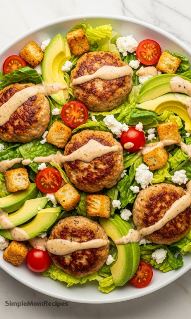 This recipe shouts the opposite. It’s a celebration, packing juicy mini turkey patties, creamy avocado, salty feta, and crunchy croutons over crisp greens.