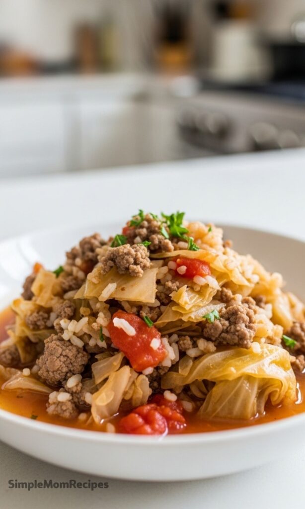 Everything cooks together in one pot. Ground beef, cabbage, tomatoes, rice. It all simmers down into this hearty, slightly saucy mixture that tastes exactly like cabbage rolls without the rolling part.